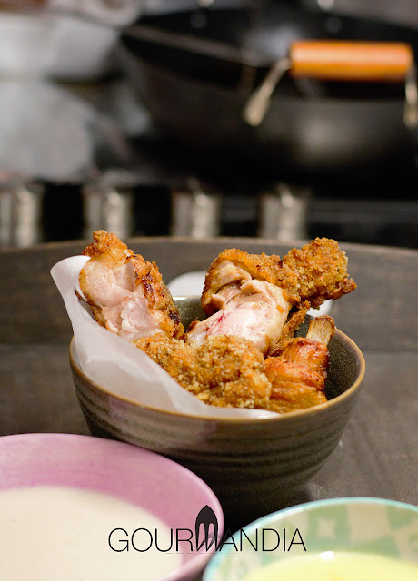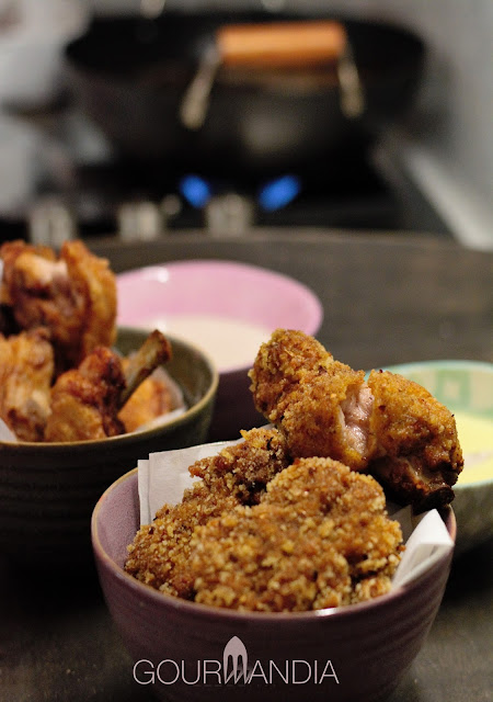 2 lt di olio di semi di arachidi, 100 g di farina ‘1’, sale e pepe nero q.b.: togli il pollo dalla marinatura, lascialo su una griglia in modo che perda l’eccesso di liquido e passalo nella farina, facendola aderire in modo uniforme. In un tegame dai bordi alti porta l’olio alla temperatura di 180-190 °C, immergi i pezzi in due volte consecutive per evitare di far abbassare la temperatura.