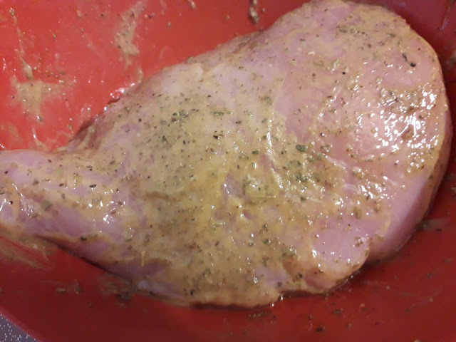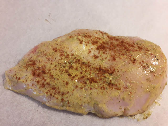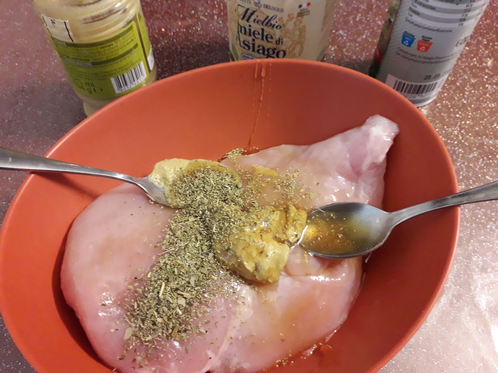 In una ciotola lasciamo macerare x cca 1 ora il pollo con 2 cucchiaini di miele,senape e spezie.