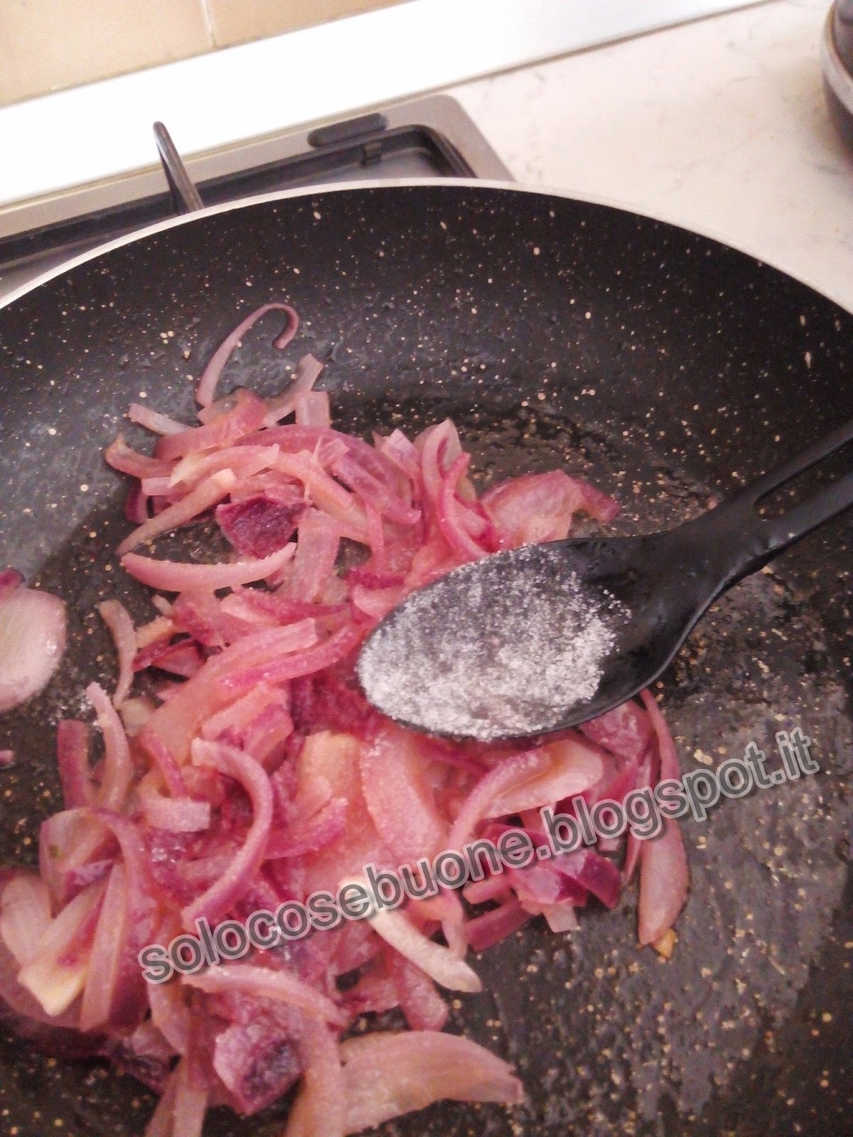 Mettiamo le cipolle in padella con olio d’oliva e lasciamo appassire, unendo un goccio d’acqua.