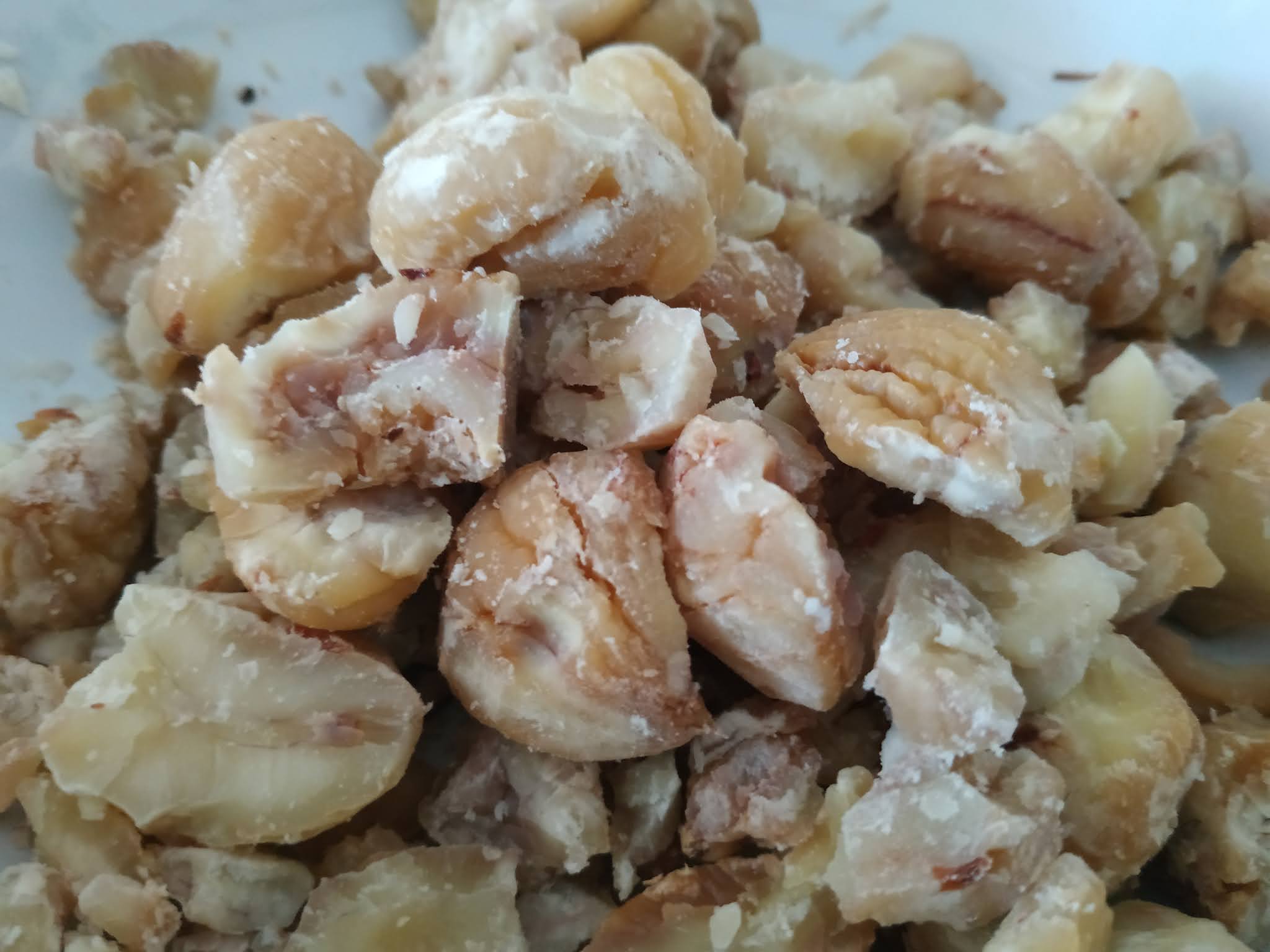 Bollire le castagne dopo averle incise leggermente in acqua con due foglie di alloro. Dopo 20/30 minuti circa, privarle di buccia e pellicina.