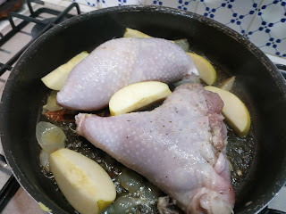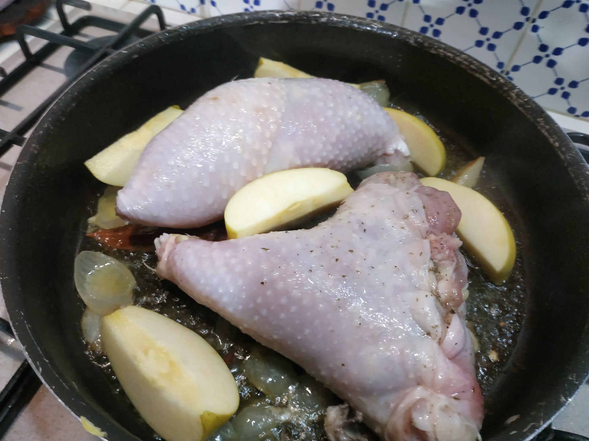 Faccio rosolare la carne in una teglia dove ho messo uno spicchio d’aglio con olio extravergine d’oliva; aggiungo le mele tagliate a grossi spicchi. Quando la carne sarà ben dorata da tutti i lati, faccio sfumare con mezzo bicchiere di vino bianco e metto il coperchio. Faccio cuocere per almeno 40 minuti.