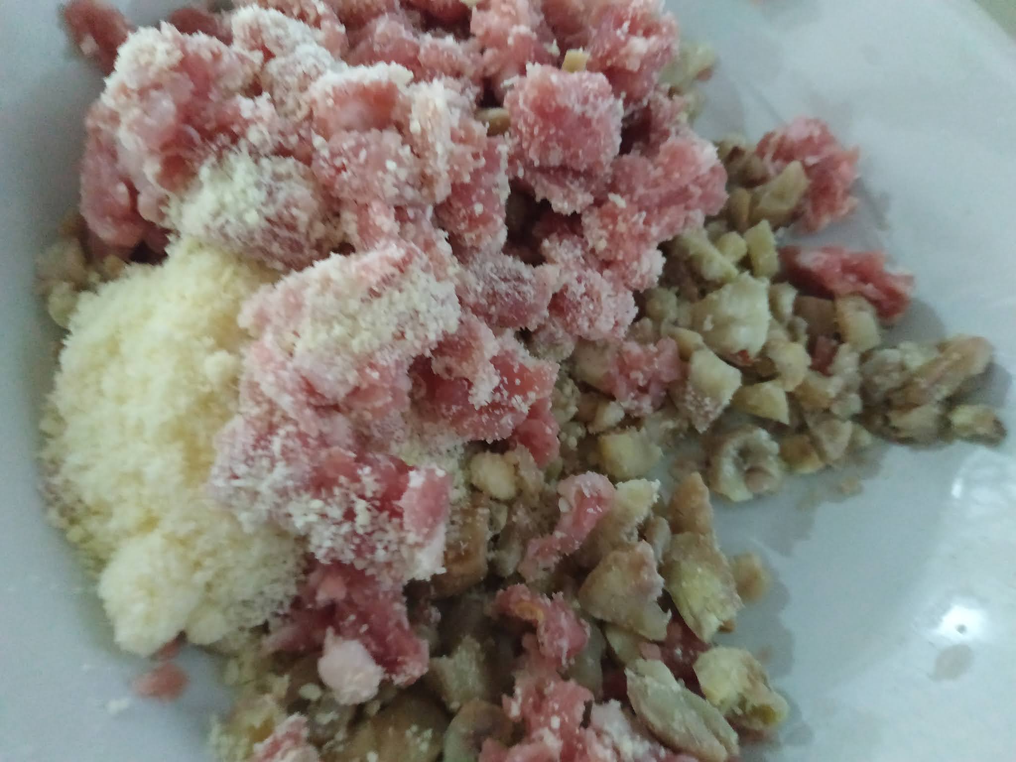 Prepariamo il ripieno con la salsiccia sbriciolata, le castagne a pezzetti, il formaggio, sale e pepe.
