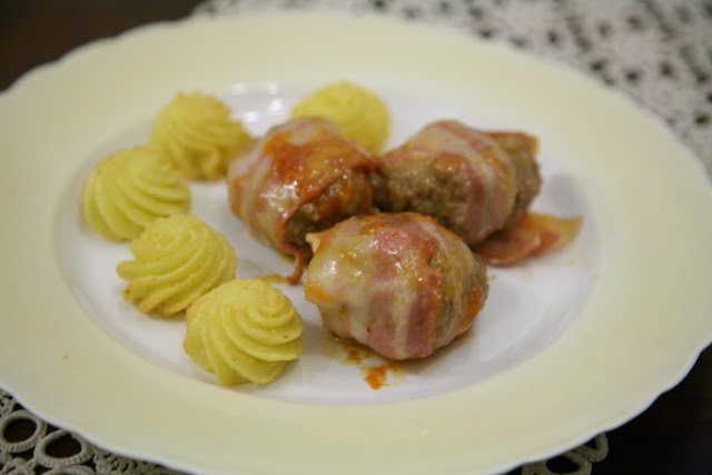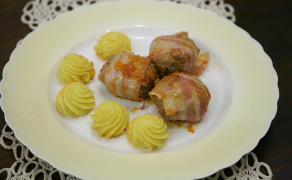 Insaporire con il sale e pepe e preparare le polpette. Una volta pronte arrotolarle in una fettina di bacon.