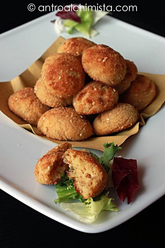 lei ho capito subito che questa ghiottoneria sarebbe stata una splendida idea per pranzo. Io però, che non amo friggere, ho cotto queste polpette al forno. Che dire? Provatele perché ne vale veramente la pena! Potete servirle come un delizioso piatto unico accompagnato da una fresca insalata di finocchi, ma sono perfette anche per un buffet, per un antipasto o per l’apericena del sabato sera.