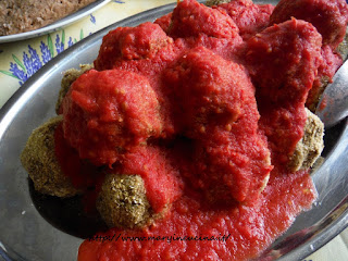 Cuocere le lenticchie in pentola coperte d’acqua per 30 minuti. Lasciar raffreddare un po’, eliminare la maggior parte dell’acqua di cottura e tritarle con pomodori e pistacchi. Ottenere delle polpettine passandole nella farina di mais e distribuire su una teglia con cartaforno. Cuocere a 190° per 25 minuti. Nel frattempo cuocere in padella i pomodori a tocchetti, quando si saranno ammorbiditi tritarli ed aggiungere sale ed olio. Distribuire su un vassoio le polpette e versarvi la passata.