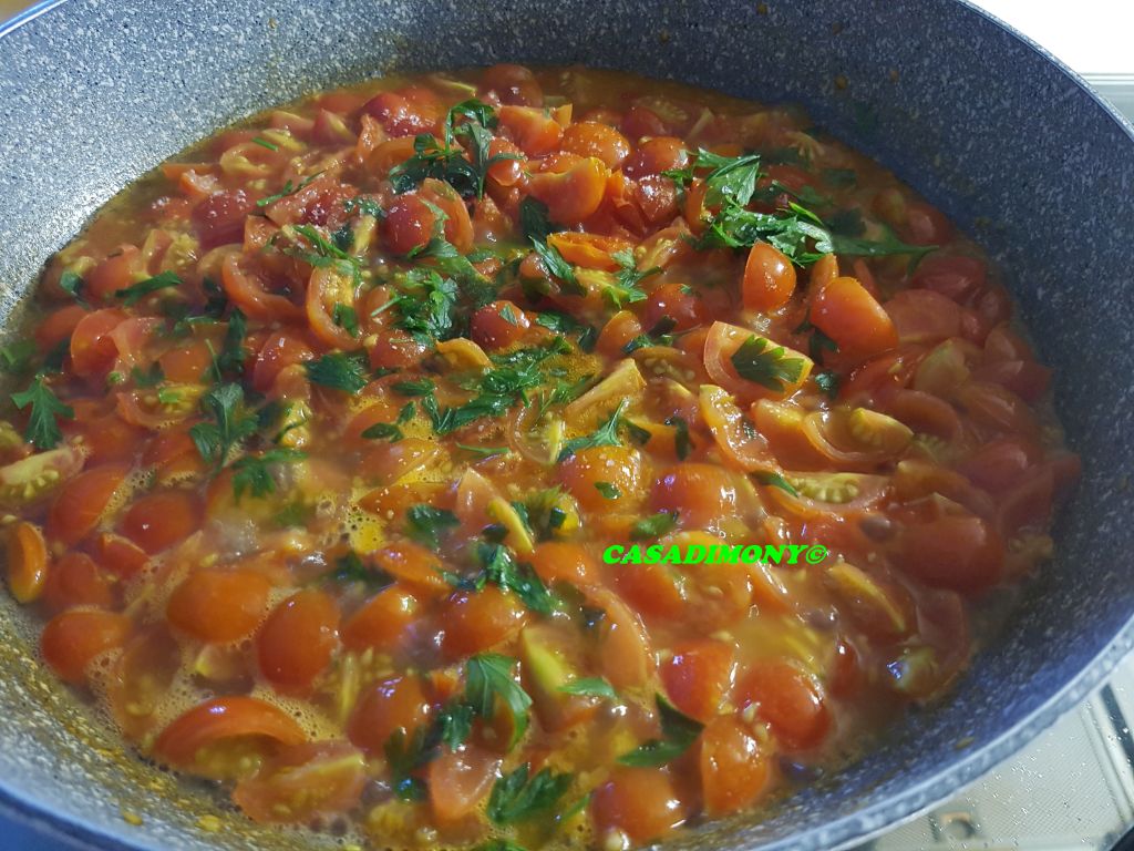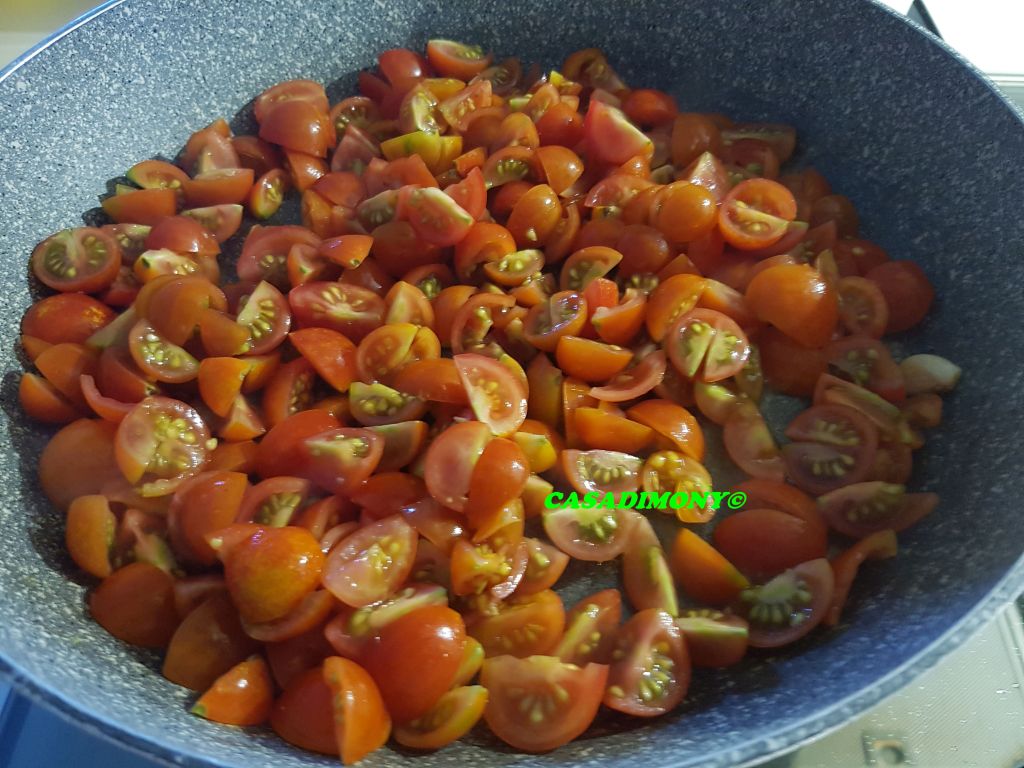 Intanto ho tagliato i pomodorini e li ho messi in una padella con un goccio di olio