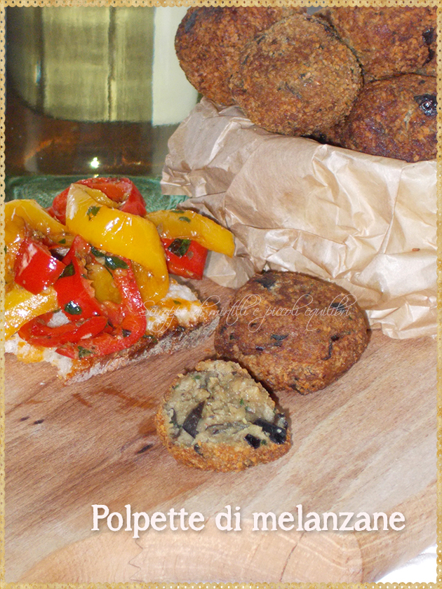 Le polpette di melanzane sono per me una tira l’altra; le ho accompagnate con i peperoni alla napoletana adagiati su pane leggermente bruscato.