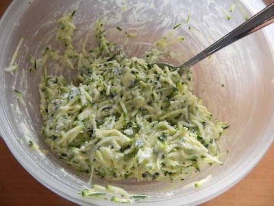 Lavare, spuntare e grattugiare le zucchine, lasciare colare l’acqua per 30 minuti. Mettere le zucchine in una ciotola, aggiungere la ricotta,