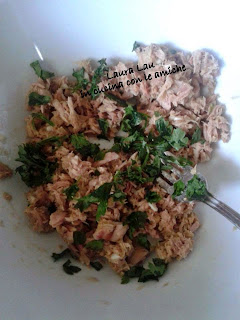 Apri le scatolette di tonno e scola l’olio, versa il tonno in un recipiente e aggiungi l’aglio tagliato molto finemente, l’acciuga, il prezzemolo tritato, sala leggermente e schiaccia il tutto con una forchetta.