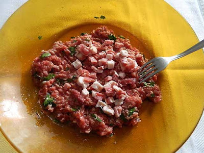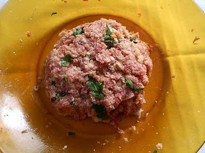 In un ampio piatto amalgamare la carne macinata con l’uovo, il sale, il pepe e il prezzemolo spezzettato,