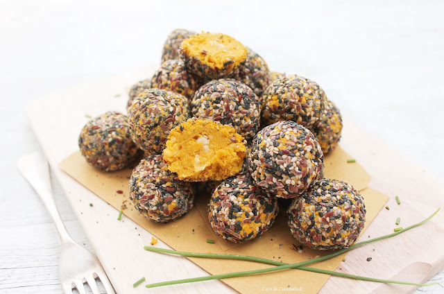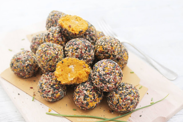 Le polpette hanno una consistenza morbida e compatta, se le volete rendere più soffici potete sostituire 200 g di legumi con lo stesso peso patata lessata. In un mixer da cucina con lama unire tutti gli ingredienti tranne la farina di mais ed i semi oleosi. Frullare fino a creare una crema compatta e assaggiare per poter regolare di sale e pepe. Aggiustare la consistenza con la farina di mais aggiungendone un po’ alla volta. Si deve ottenere un composto non troppo duro, ma facilmente lavorabile. Creare 24 palline e impanarle con i semi oleosi. Infornare a 180°C per una ventina di minuti circa.