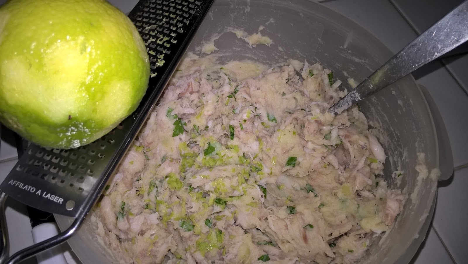 Unite alla polpa del pesce le patate schiacciate, il prezzemolo tritato, pangrattato quanto basta per avere un composto non troppo molle, buccia grattugiata di un limone, un albume per legare (non uso il tuorlo per non alterare il gusto del pesce).