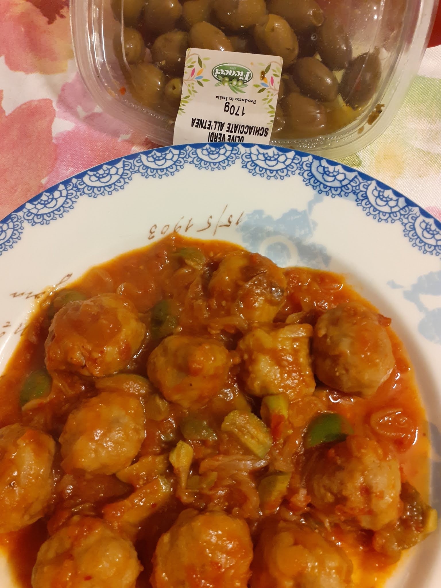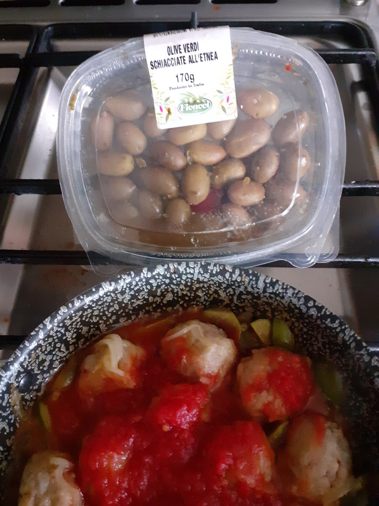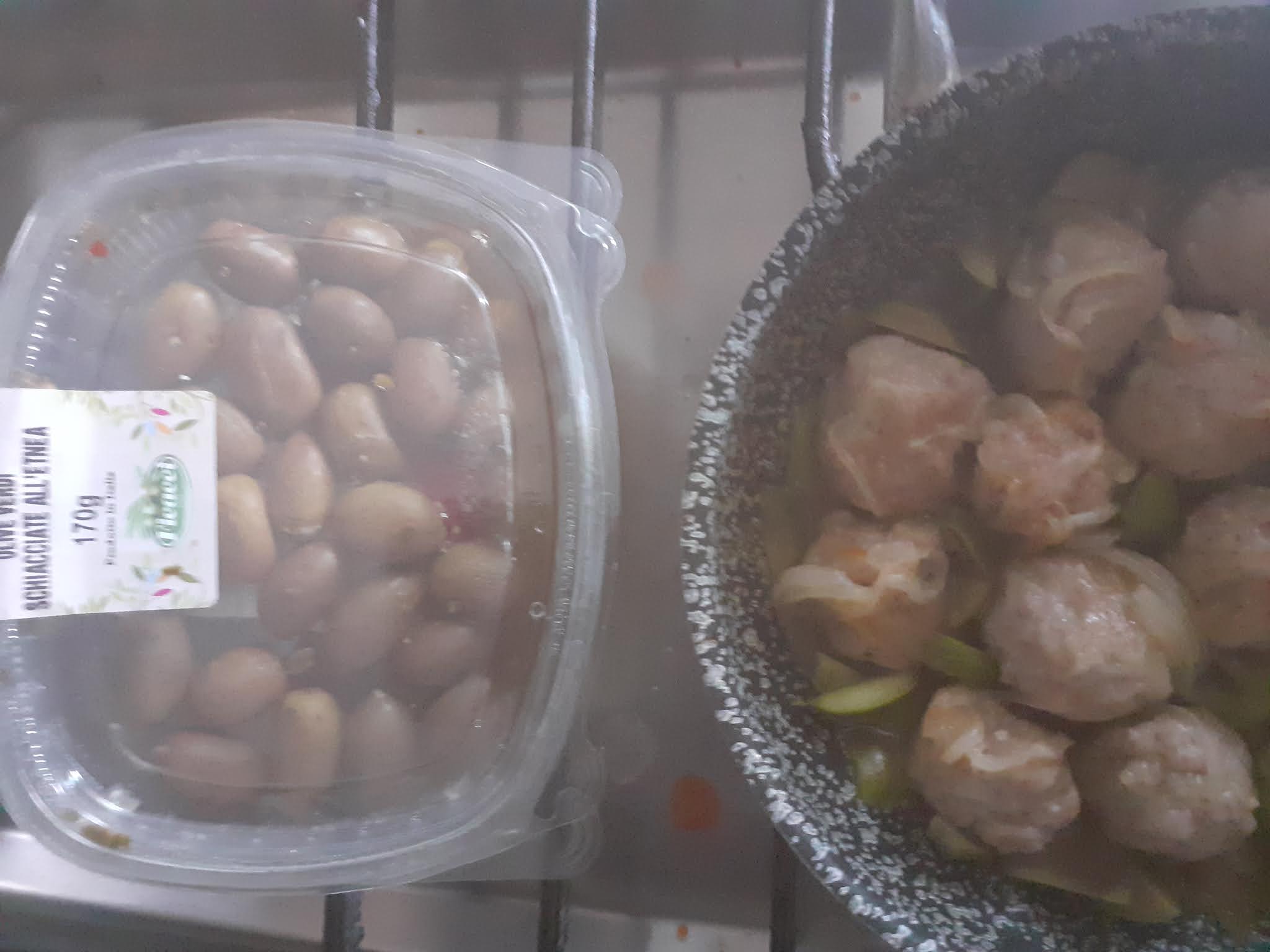 400g.misto di pollo e tacchino,1 uovo,poca mollica di pane bagnato e strizzato,1 cucchiaio formaggio grana,sale e pepe qb,1 cipolla bianca affettata,1 bicchierino vino bianco,6/7 olive verdi schiacciate all’Etnea Az Ficacci ,denocciolate e tritate,250g polpa di pomodori,olio evo q.b!