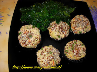 Lessare le patate a cubetti per 25 minuti. Cuocere al vapore le carote a cubettini ed i piselli per 15 minuti. Schiacciare le patate con lo schiacciapatate. Mescolare 2 cucchiai di farina di ceci con un po’ d’acqua di cottura delle patate ed aggiungere un pizzico di sale e pepe. Aggiungere un po’ di curcuma e mescolare tutto con le patate. Aggiungere carote e piselli, mescolare. Ottenere delle polpettine e passarle nei semi. Adagiarle su una teglia con cartaforno e cuocere a 180° per 15 minuti. Aggiungere un filo d’olio a piacere. Accompagnare con verdure a piacere, io ho scottato gli spinaci pochi minuti in padella con un filo d’olio, un pizzico di sale ed un po’ di limone.