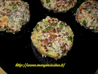 600 gr patate, 190 gr piselli freschi, 190 gr carote, semi misti (sesamo, lino, canapa, papavero), sale curcuma, olio extravergine d’oliva, farina di ceci.