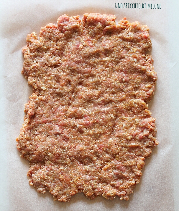Mescolate bene il tutto e andate a stendere in modo omogeneo il vostro composto di carne su un’altra carta da forno.