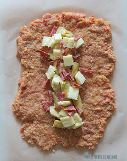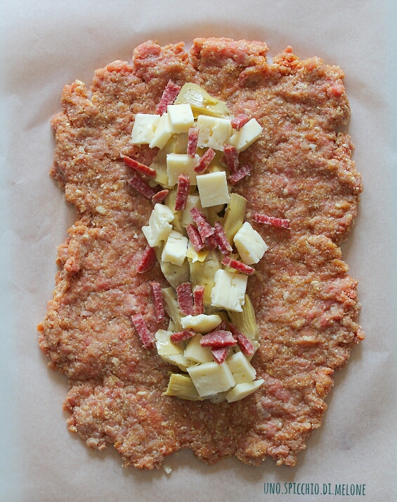 Ora potete farcire il CENTRO del polpettone con i CARCIOFI, il SALAME AQUILANO CLAI e L’ASIAGO.