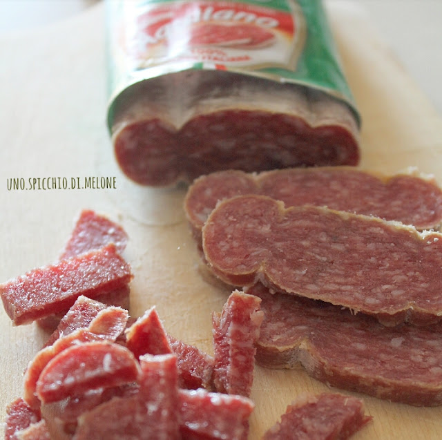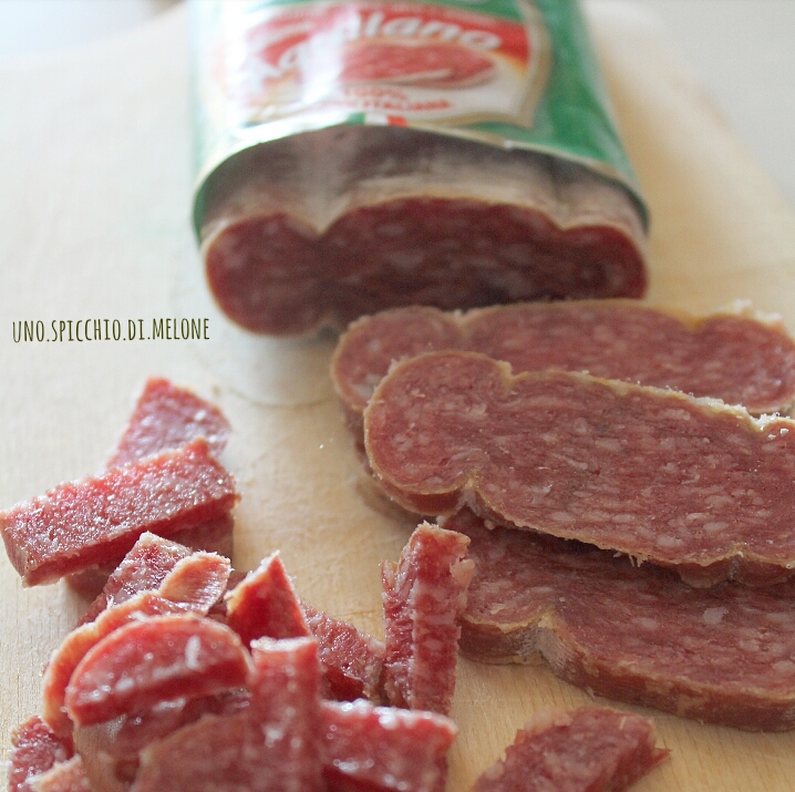 Intanto, preparate un bel vassoio, un po’ di salame e asiago tagliati a dadini da utilizzare come decorazione.