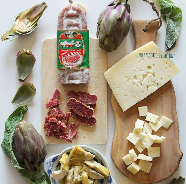 Il SALAME AQUILANO, tipicamente abruzzese, ha una forma irregolare ed un sapore speziato, in perfetto abbinamento, dunque, con i CARCIOFI (amari e delicati) e L’ASIAGO (fresco e gradevole).
