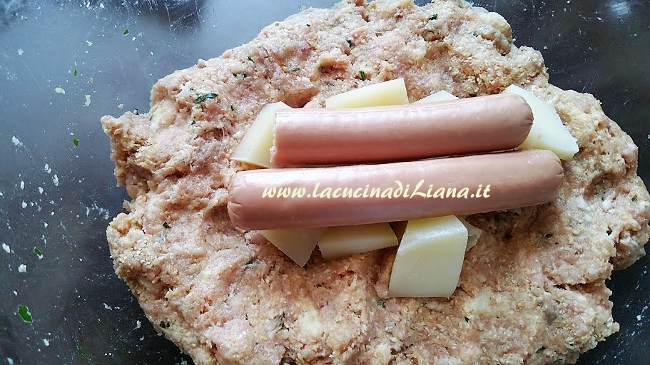 Dividere in 2 parti il composto e, uno per volta schiacciarli in un rettangolo e porvi al centro 2 wurstel interi e il formaggio a dadini, quindi richiudere il cilindro per formare due polpettoni delle dimensioni giuste per essere cotti nella pentola a pressione.