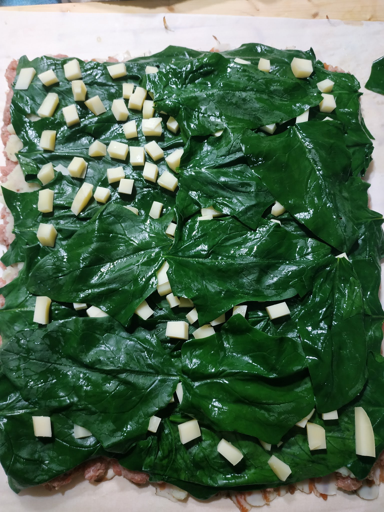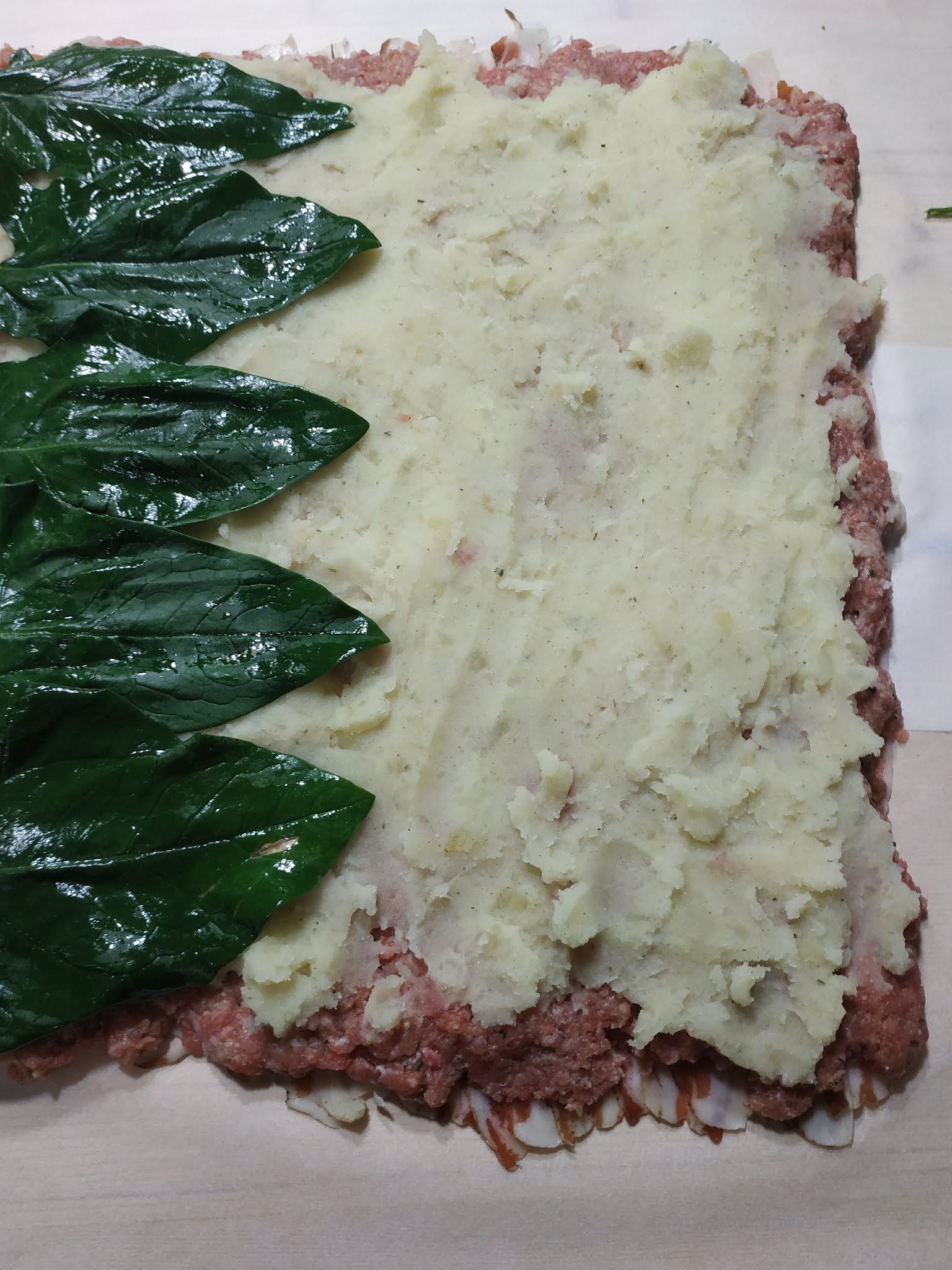 Sistemate la carne sulla pancetta , quindi spalmate sopra le patate schiacciate (naturalmente, leggermente salate), ricoprite con le foglie degli spinacini che avrete sbianchite prima (scottate due secondi in acqua bollente per mantenere il loro bellissimo verde).