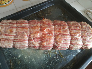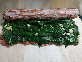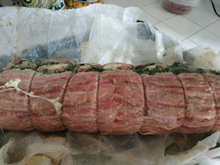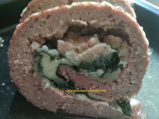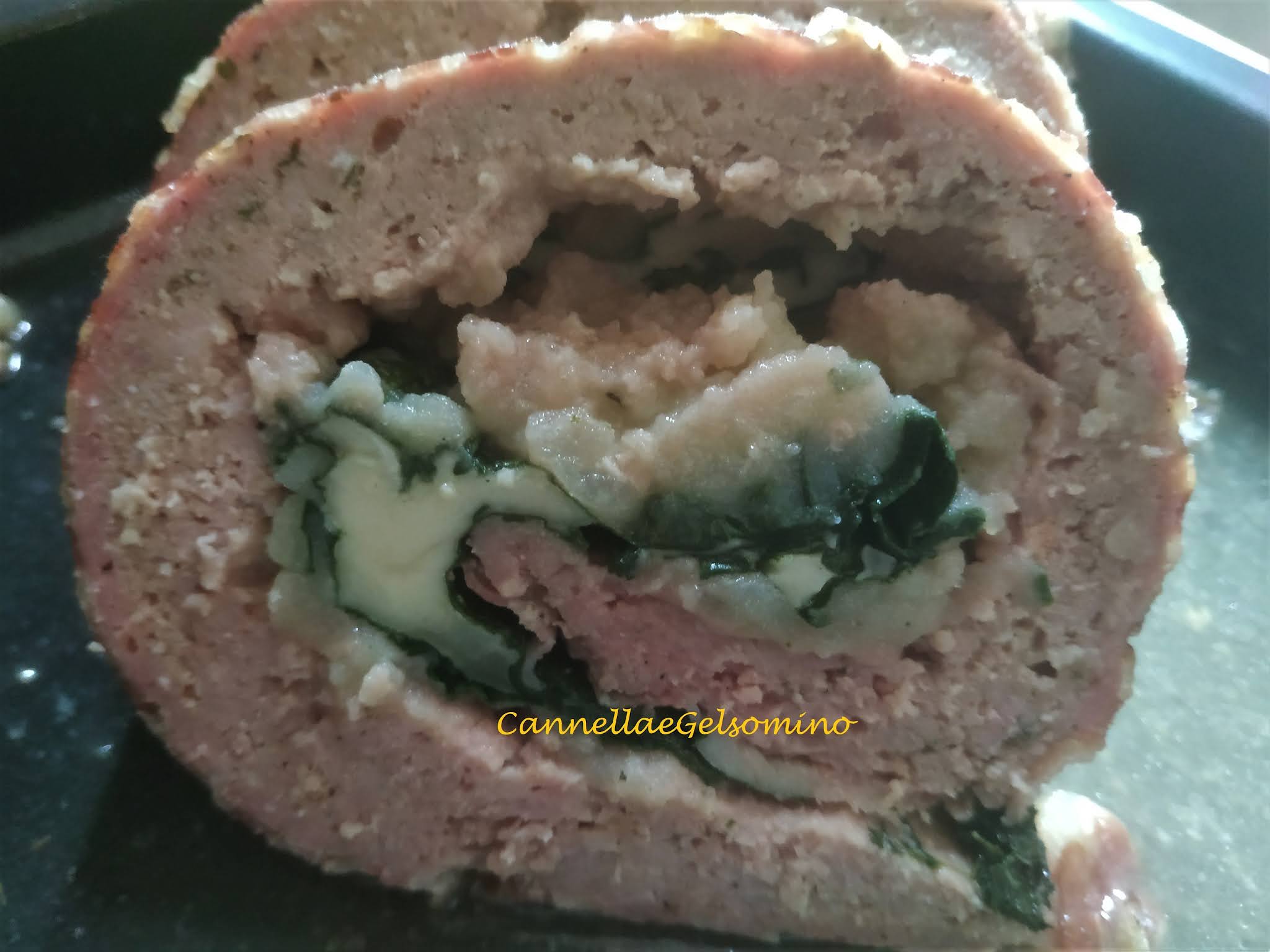 Ingredienti: 1 kg di carne tritata (50% vitello, 50% maiale ma potete scegliere tranquillamente ciò che vi piace), 4 uova, 10 cucchiai di pangrattato ammorbidito con un po’ di latte, 100 g di parmigiano grattugiato, noce moscata, pepe nero, sale, qualche erbetta profumata (prezzemolo o erba cipollina o se vi piace aglio), due o tre patate lessate e schiacciate, spinacini freschi, 200 g di formaggio morbido 8fontina o provoletta o emmenthal), pancetta di maiale tagliata sottilissima (non l’insaccato per intenderci, spiegate l’utilizzo al vostro macellaio).