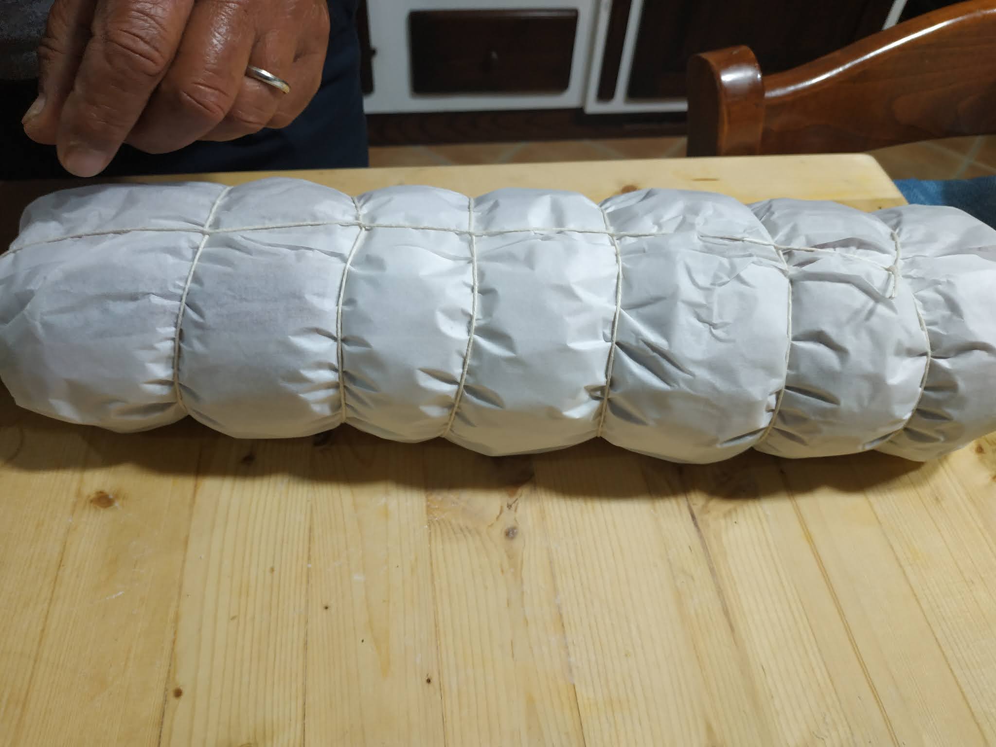 Aiutandovi con la carta da forno, arrotolate il polpettone, quindi avvolgetelo e legatelo con spago da cucina.