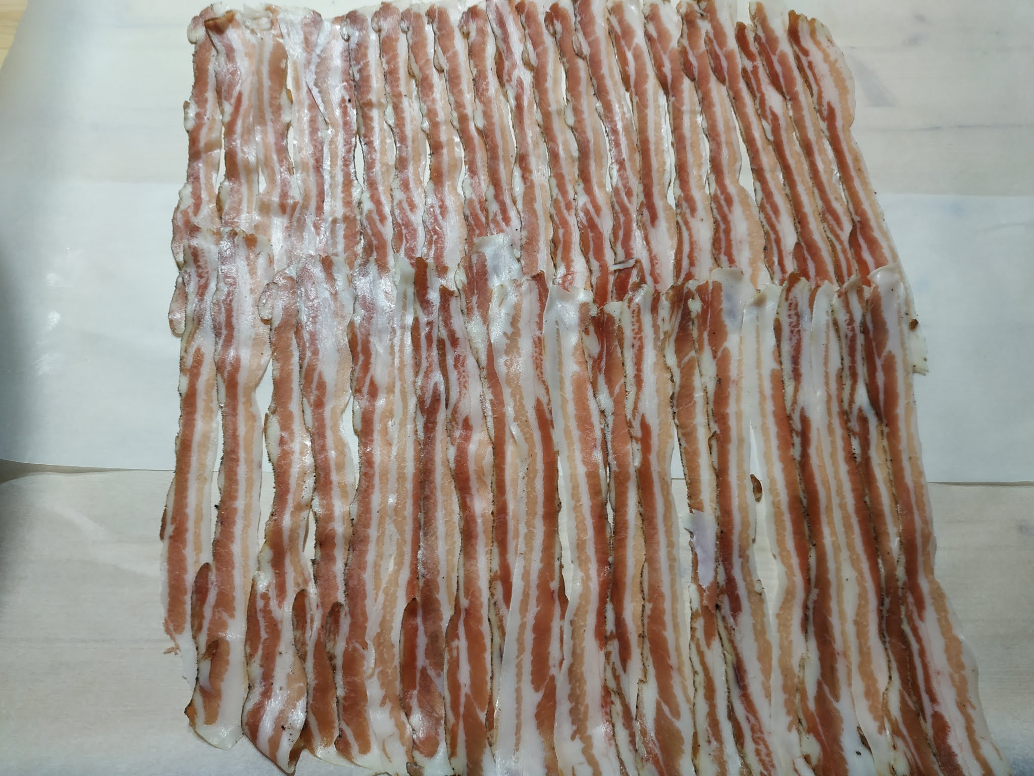 Stendete sul tavolo due fogli sovrapposti di carta da forno sulla quale sistemerete le fettine di pancetta che costituiranno la parte esterna del nostro polpettone.