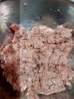 Impastate la carne con le uova, il pangrattato, il formaggio e gli aromi.