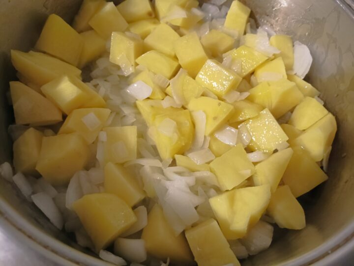 Unire le patate tagliate a cubetti e far cuocere per circa 10 minuti.