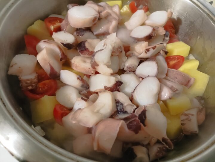 Dopo altri 10 minuti di cottura aggiungere il polpo a pezzetti, mescolare, abbassare la fiamma e mettere il coperchio. Far cuocere per circa un’ora.