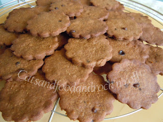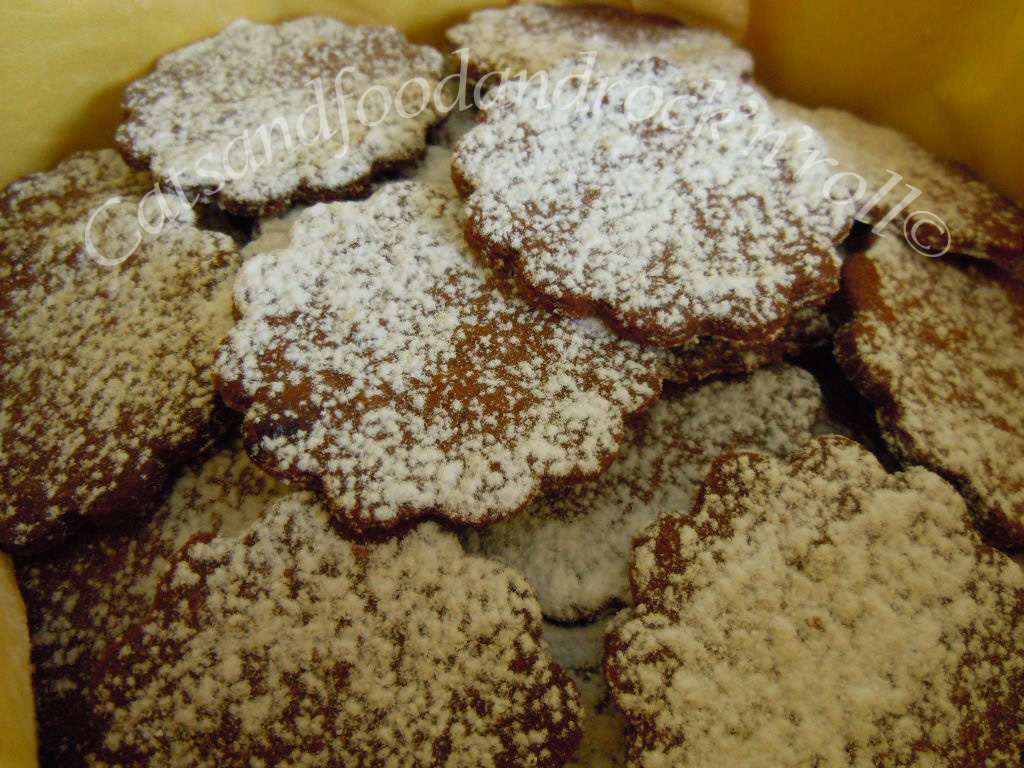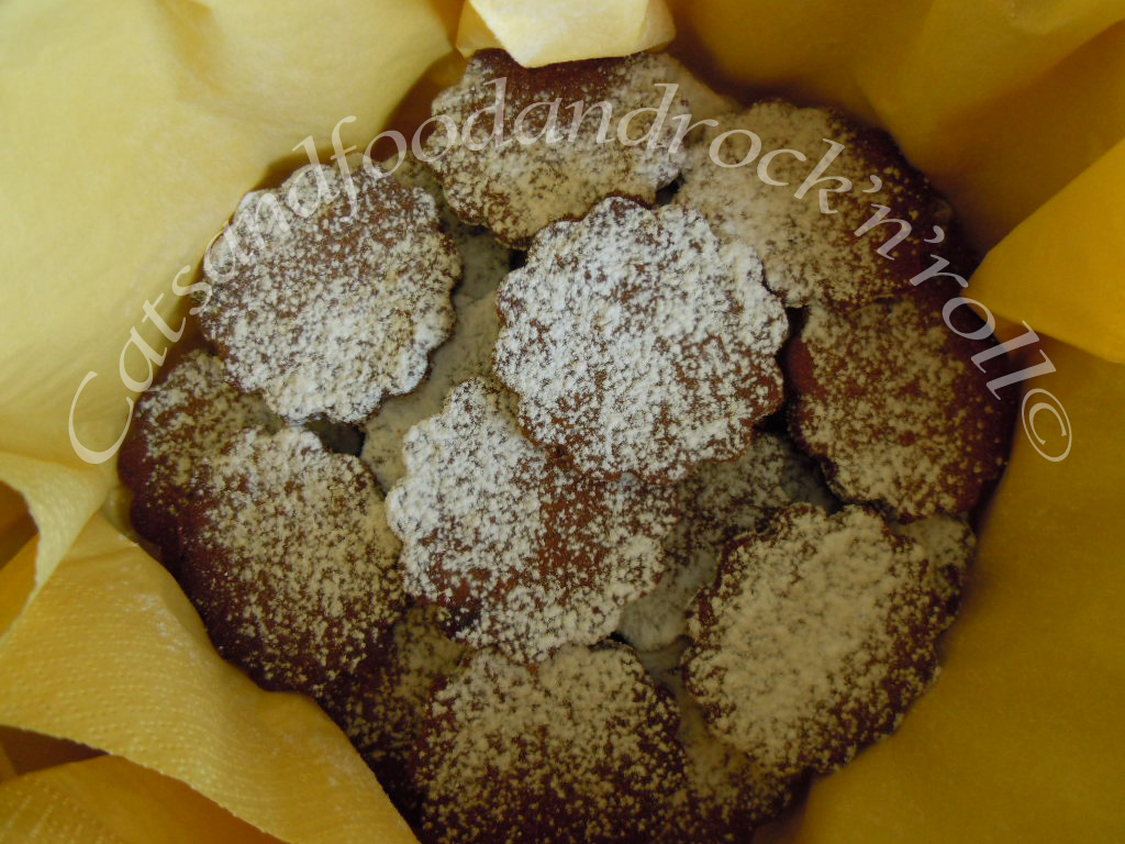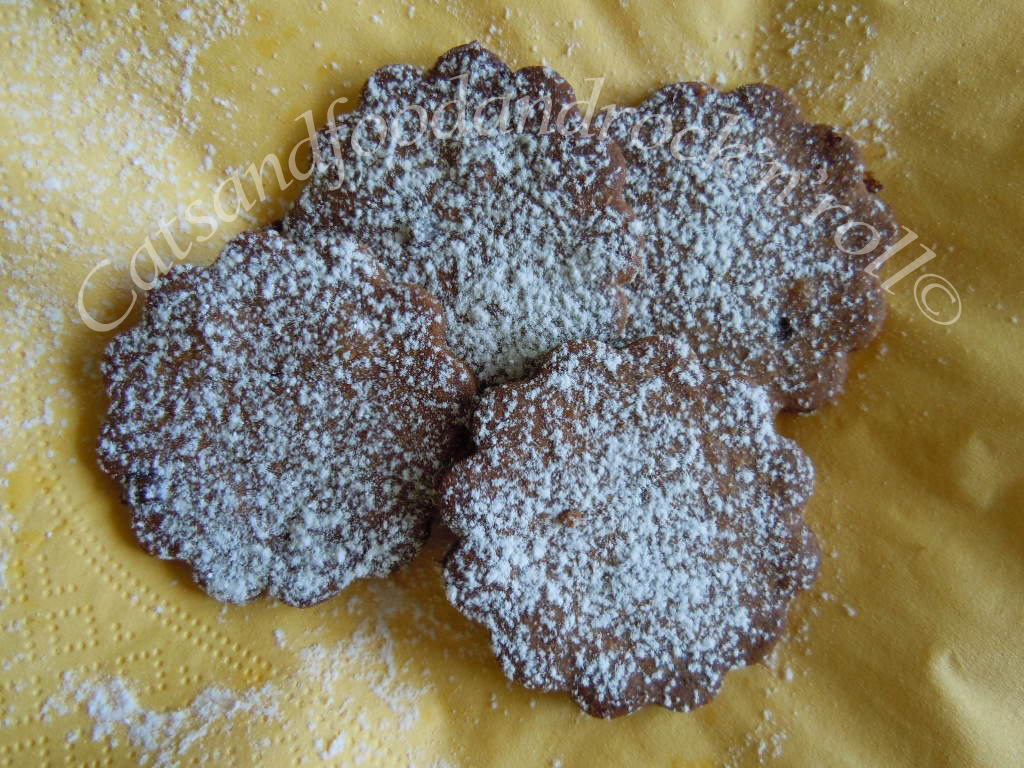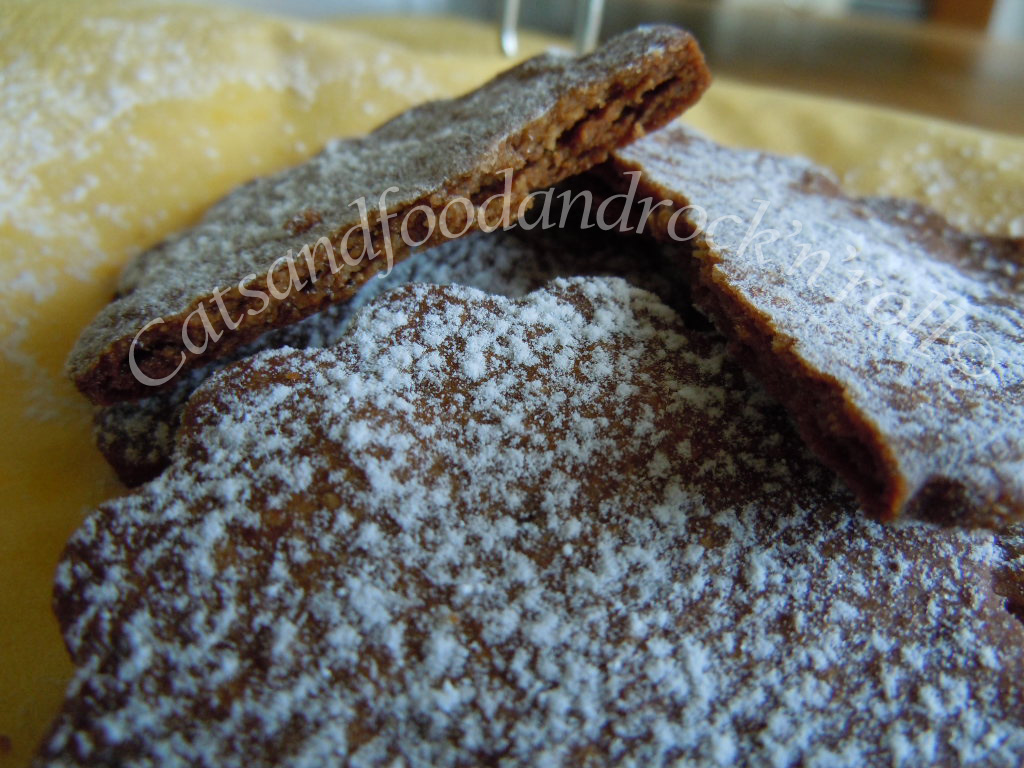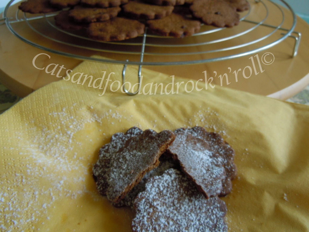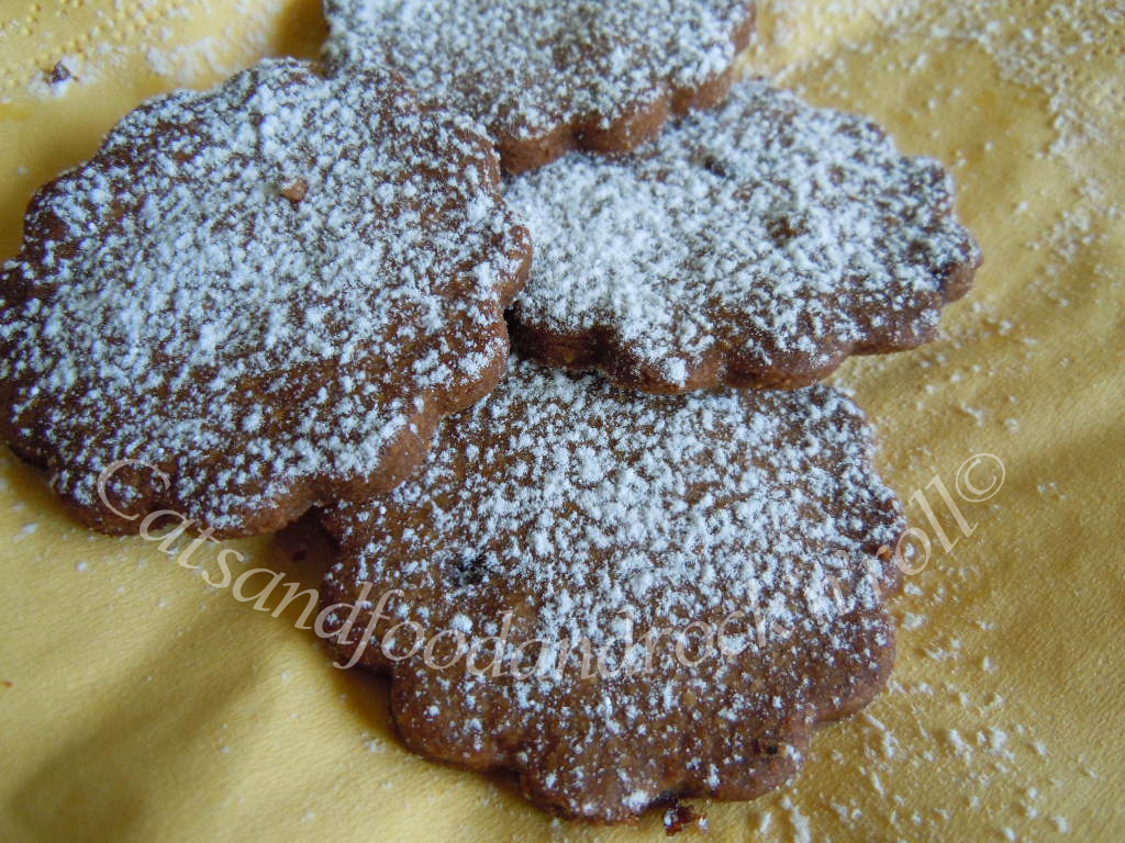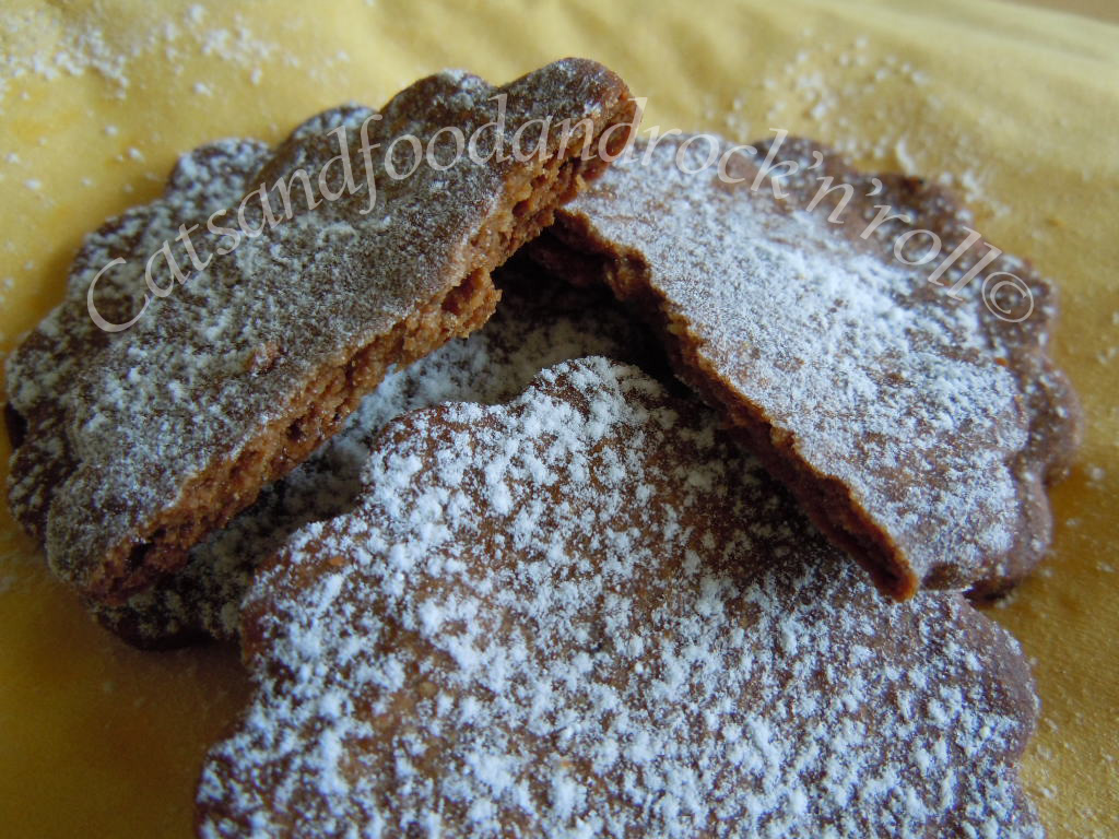 Impastare tutti gli ingredienti, a mano o nell’impastatrice, come si preferisce, e far riposare la massa almeno un’ora in frigo, dopo averla avvolta nella pellicola alimentare. Quindi riprenderla, stenderla col mattarello e coppare i biscotti nella forma desiderata. Io ho ricavato una quarantina di biscotti, ma li ho fatti troppo sottili. Non contenendo agenti lievitanti di alcun tipo, questi biscotti non gonfiano per niente, per cui conviene farne magari di meno, ma tenersi più larghi con lo spessore della sfoglia.