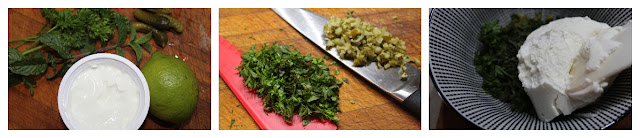 Tritate finemente al coltello i cetriolini e le foglioline delle erbe aromatiche.