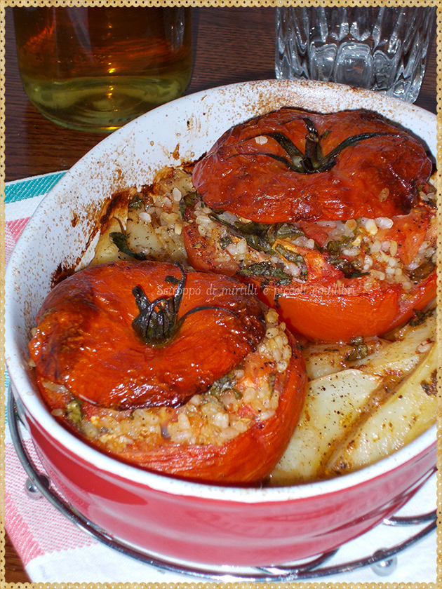 Si tagliano a fette le patate, si mettono in una pirofila, si salano, si pepano e si unisce un filo di olio extra vergine di oliva. Si dispongono sopra i pomodori svuotati, si salano leggermente e si riempiono con il riso condito. Si ricopre ogni pomodoro con la sua calotta; se avanza il riso condito si deposita sulle patate. Si aggiunge un filo di olio extra vergine di oliva. Si mettono in forno ben caldo a 180° C per almeno 40 minuti.