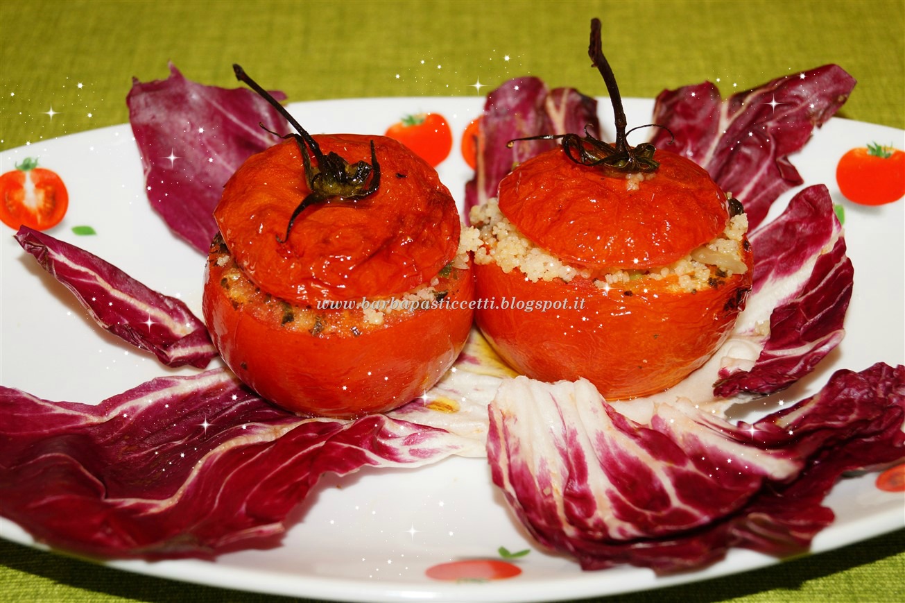 Quando i pomodori saranno cotti, riempirli con il cous cous, coprire con le caolottine e servire tiepidi.