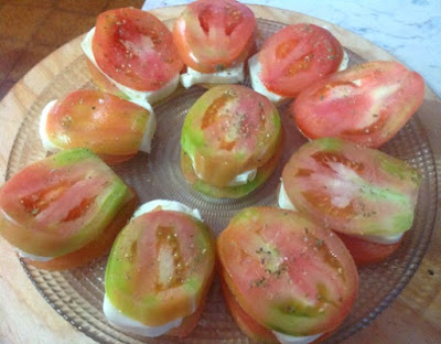 Formare dunque il panino: cioè una fetta di pomodoro, una fetta di mozzarella ed un’altra di pomodoro. Premere bene.
