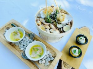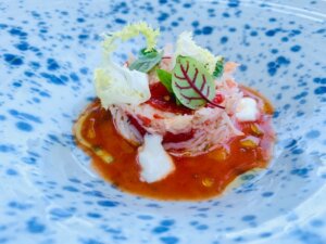 La mia gourmet experience inizia con un trionfo di amuse bouche, uno più buono dell’altro: caprese rivisitata con succo di pomodoro, stracciatella e olive; gambero rosso di Sicilia con crema al prezzemolo e branzino con frutto della passione e crème fraîche; ceviche di ricciola; cremoso di ricotta e carote. Ma lo “stuzzico” più intrigante e godurioso, è l’ostrica in tempura con maionese al lime, da mangiare in un solo boccone e gustare a lungo in bocca. Un’idea innovativa di presentare la regina del mare e un entrée che ricorderò a lungo.
