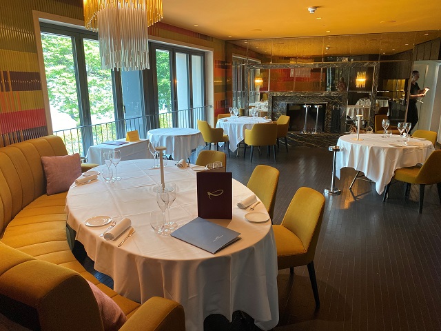 Al primo piano, che si può raggiungere con le scale o in ascensore, si alternano diverse sale: quella con il caminetto di marmo a vista, tavoli rotondi finemente apparecchiati, e un grande tavolo ovale con divanetto per 10 persone; un’altra sala con tavoli rotondi e divani in stoffa. Tutte accomunate da grandi vetrate che aprono lo sguardo sul lago e rendono piacevole il pasto dei clienti in un’atmosfera ovattata e super rilassante.