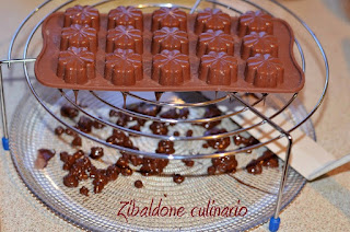 Con un cucchiaino versare un poco di cioccolato in ogni foro, ribaltare lo stampo e agitare leggermente in modo da far cadere nel piatto il cioccolato in eccesso.