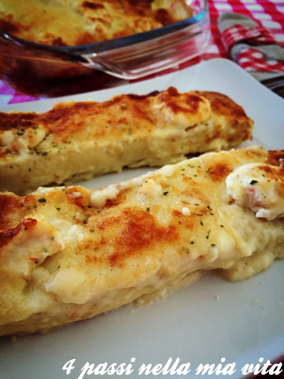 Versiamo sul fondo di una pirofila 2 mestoli di besciamella, riempiamo le crespelle con la crema di ricotta, chiudiamole a cannolo e disponiamole una accanto all’altra.