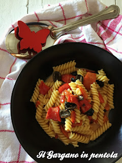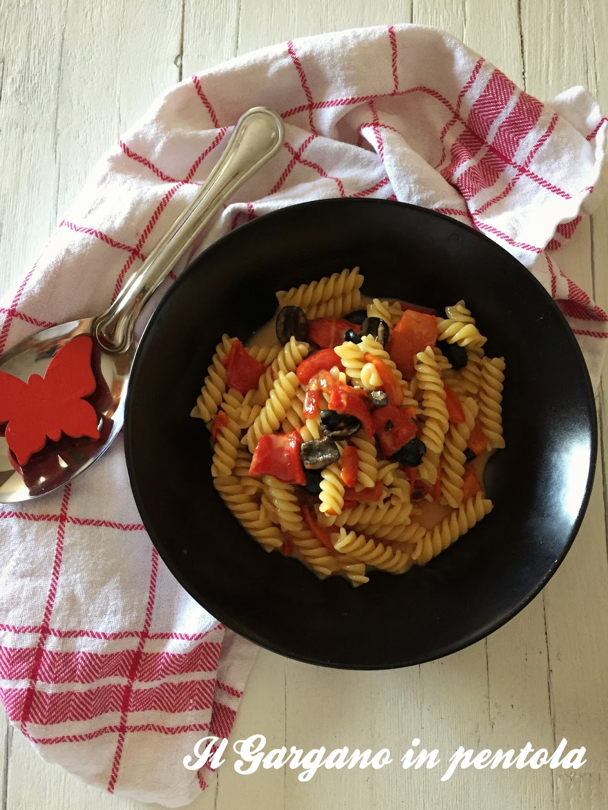 In una padella soffriggiamo lo spicchio d’aglio in olio evo, quando sarà ben dorato eliminiamolo e uniamo i peperoni e le olive spezzettate.