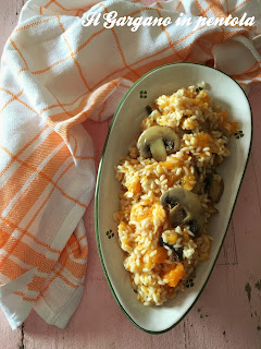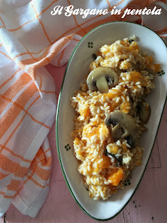 Negli ultimi 5 minuti aggiungiamo al riso la zucca e i funghi e completiamo la cottura fino al completo assorbimento del liquido