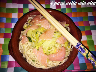 Ha come protagonisti i noodles, spaghettini di soia, conditi con verza e zucchine e con l’aggiunta del tocco finale: il salmone affumicato.
