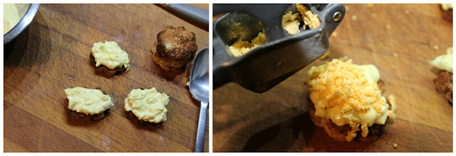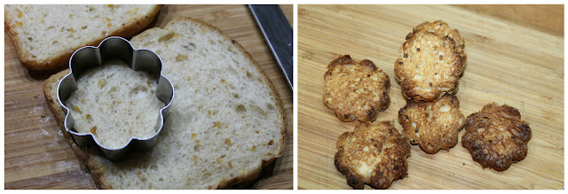 Ricavate sei tartine dalle fette di, io ho utilizzato un taglia biscotti a forma di fiore di circa 3 cm di diametro. Tostate in forno caldo a 180° per circa 3-4 minuti, meglio se le tenete d’occhio per evitare di fare pasticci.