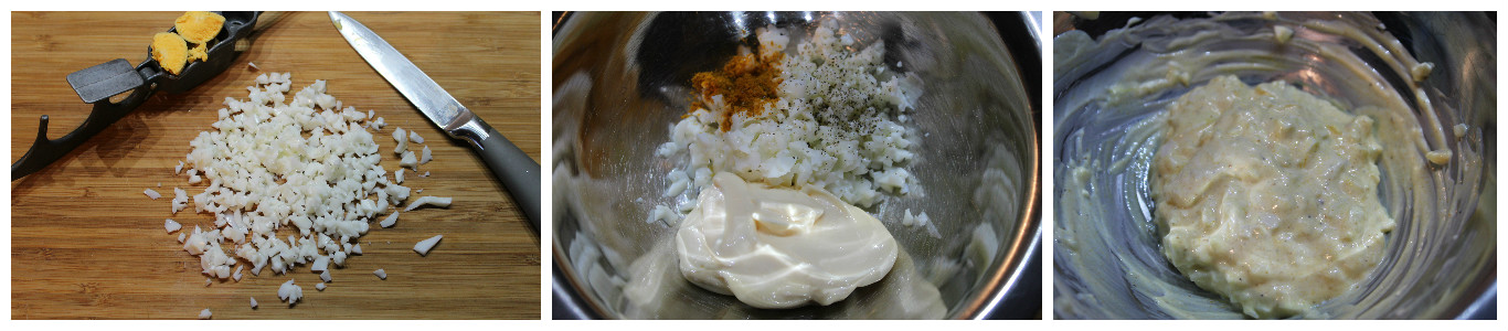 La buccia dell’uovo sodo, separate l’albume dal tuorlo e tritate quest’ultimo finissimo con il coltello.