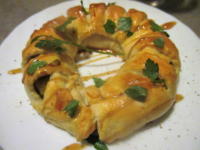 Roll out the pastry on a flat surface and divide into 2 halves. Arrange on a slice of gruyere, zucchini, porcini and a spoonful of sauce. Wrap it all then add the two extremes and strokes the surface with egg and milk. Bake at 220 degrees for about 20/25 minutes.