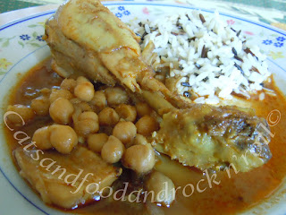 Tuffare nello stesso olio la cipolla, l’aglio e lo zenzero tritati grossolanamente e lasciar rosolare qualche minuto, quindi aggiungere il curry paste e farlo sciogliere. Allungare con mezzo litro di acqua calda, immergervi i ceci scolati dalla loro acqua e insaporire col concentrato di pomodoro, un pizzico di sale, una macinatina di pepe e il curry in polvere. Mescolare bene, quindi rimetterci i pezzi di pollo, incoperchiare, abbassare la fiamma e lasciar cuocere per 45 minuti, o comunque finché la salsa non si sia addensata e il pollo ammorbidito.