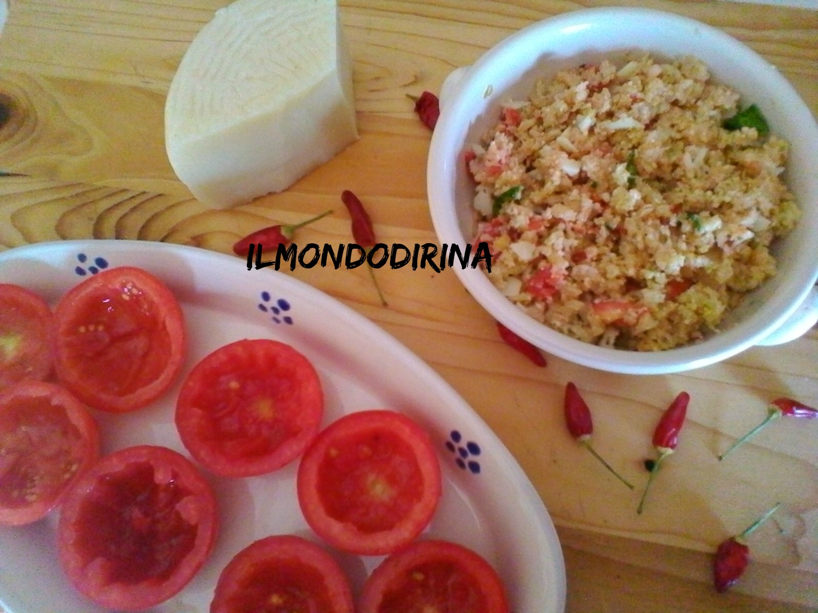 Nel frattempo versate nel robot da cucina il pane, l’aglio, il prezzemolo, il basilico e frullate. Mischiate quindi il pane con la polpa di pomodoro sminuzzata, unite successivamente il pecorino in parte grattugiato e in parte tagliato a cubetti molto piccoli, l’origano, un pizzico di sale e un uovo leggermente sbattuto. Amalgamate il tutto e riempite le coppe dei pomodori.