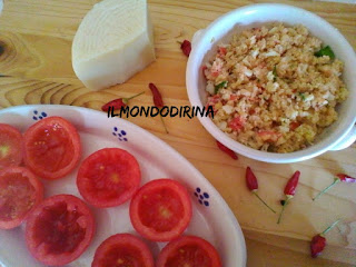 Ed ecco la mia versione…ma in bianco: non amo il prosciutto e il sapore dei nostri salami è troppo forte, si rischia di non sentire il gusto del pomodoro e così utilizzo unicamente del pecorino freschissimo, quasi un primo sale.