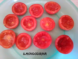 Lavate i pomodori, tagliateli a metà e svuotateli dalla polpa. Salate ogni coppa e mettetele a testa in giù per almeno 30 minuti.